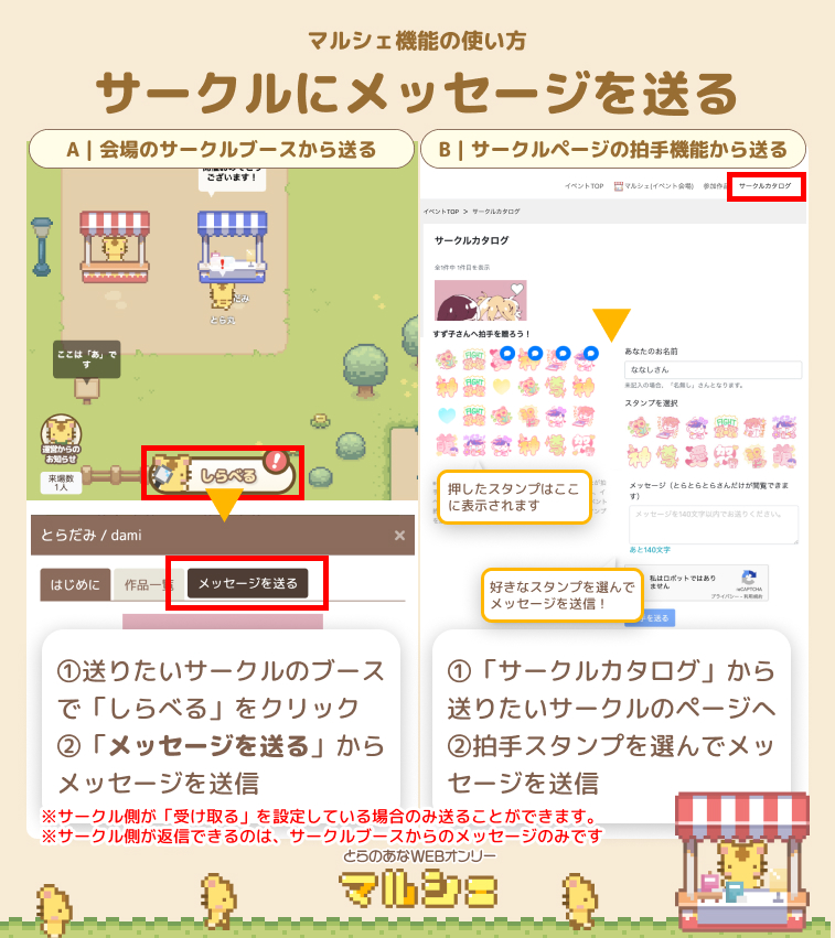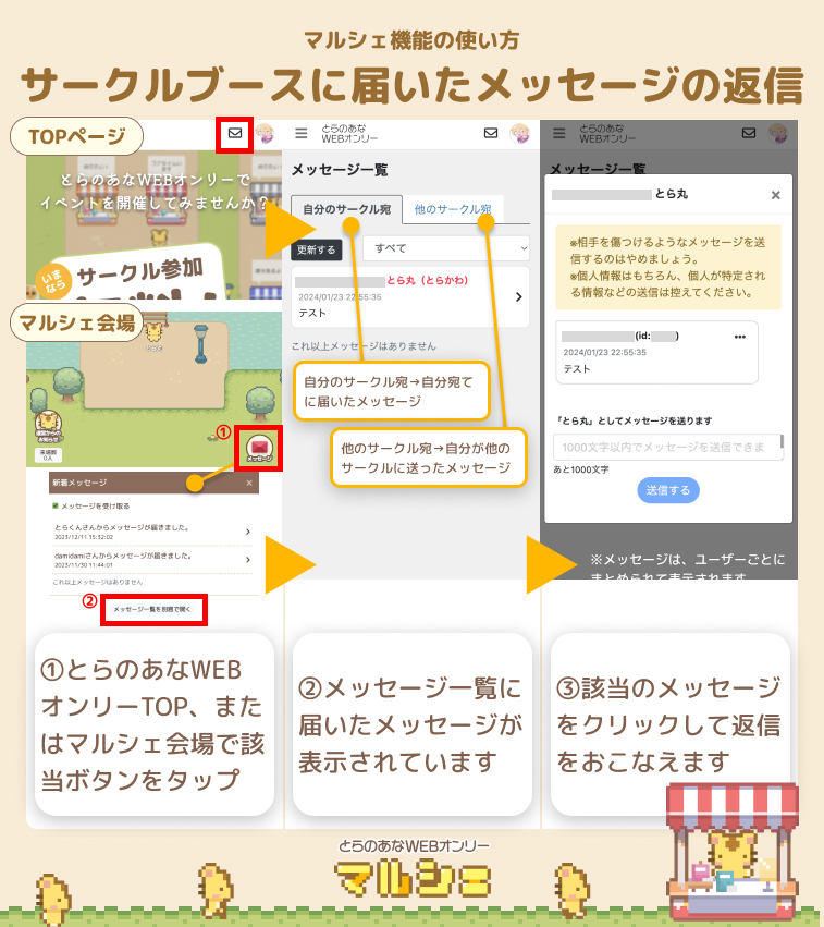サークルブースに届いたメッセージに返信することができます。サークルブースに届いた・送ったメッセージは、イベント終了後でも閲覧・返信できます。