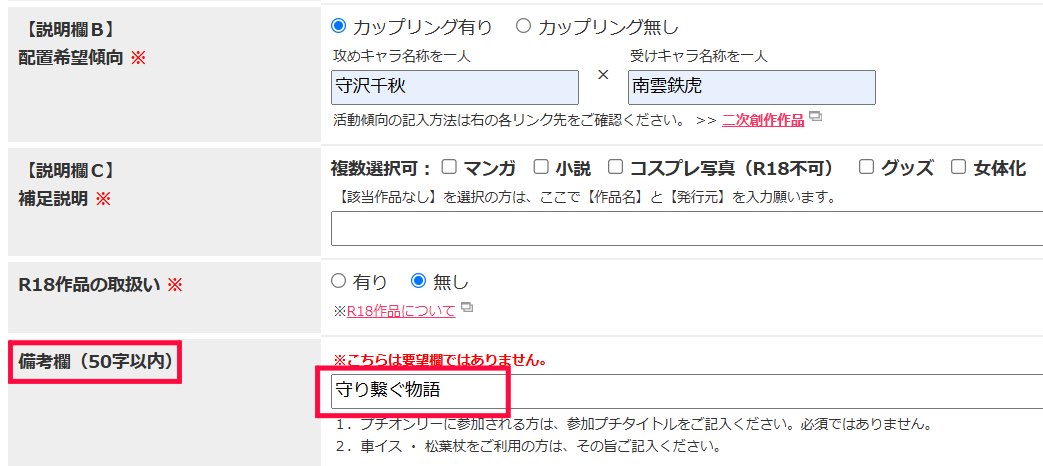 ただし、配置に関しては作品傾向・メインキャラ・カップリングが優先されますので、